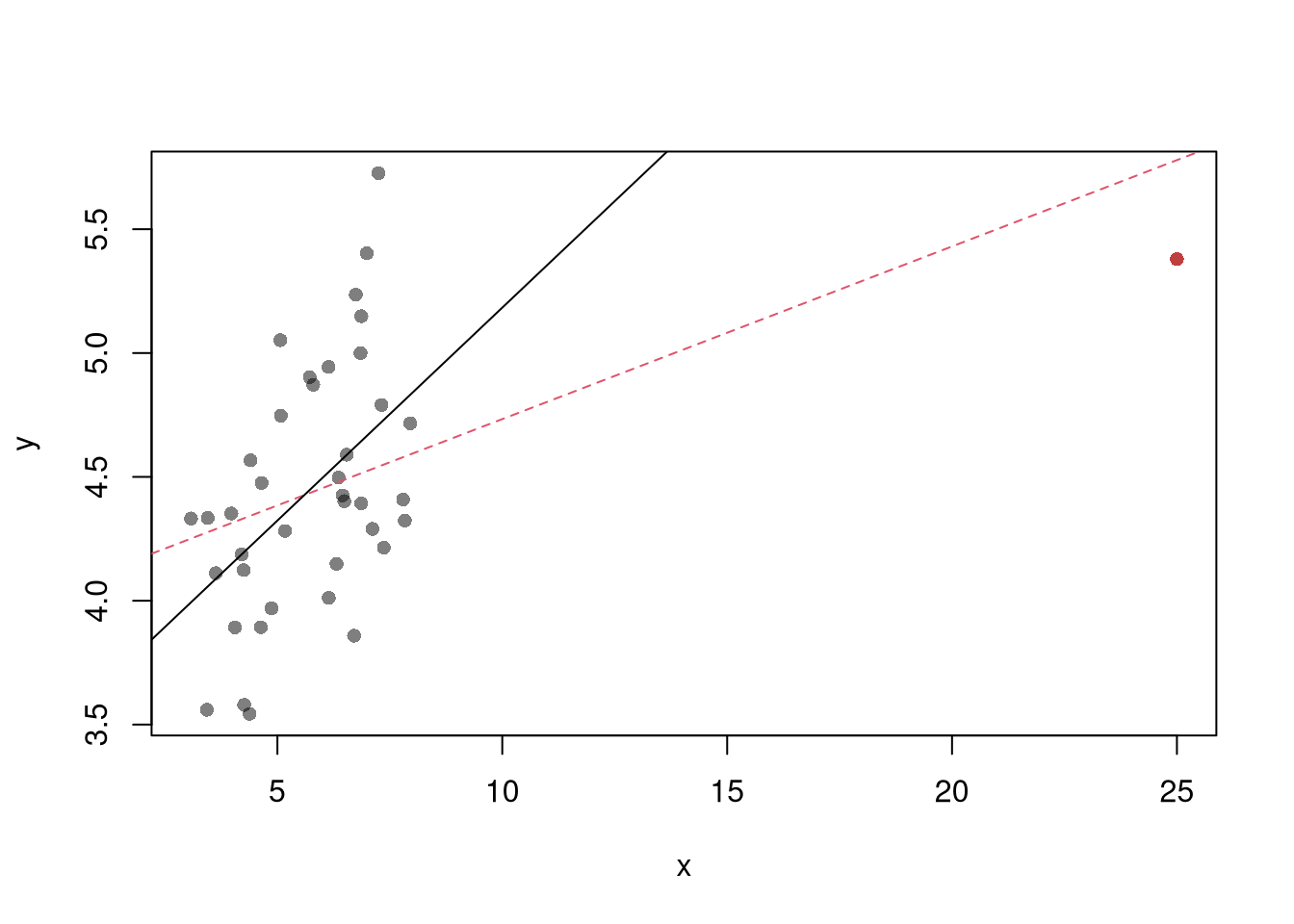 The third diagnostic plot examines another type of outlier, the observed explanatory variable \(\hat{X}_{i}\) is far from the others. A point has high leverage if the estimates change dramatically when you estimate the model without that data point.