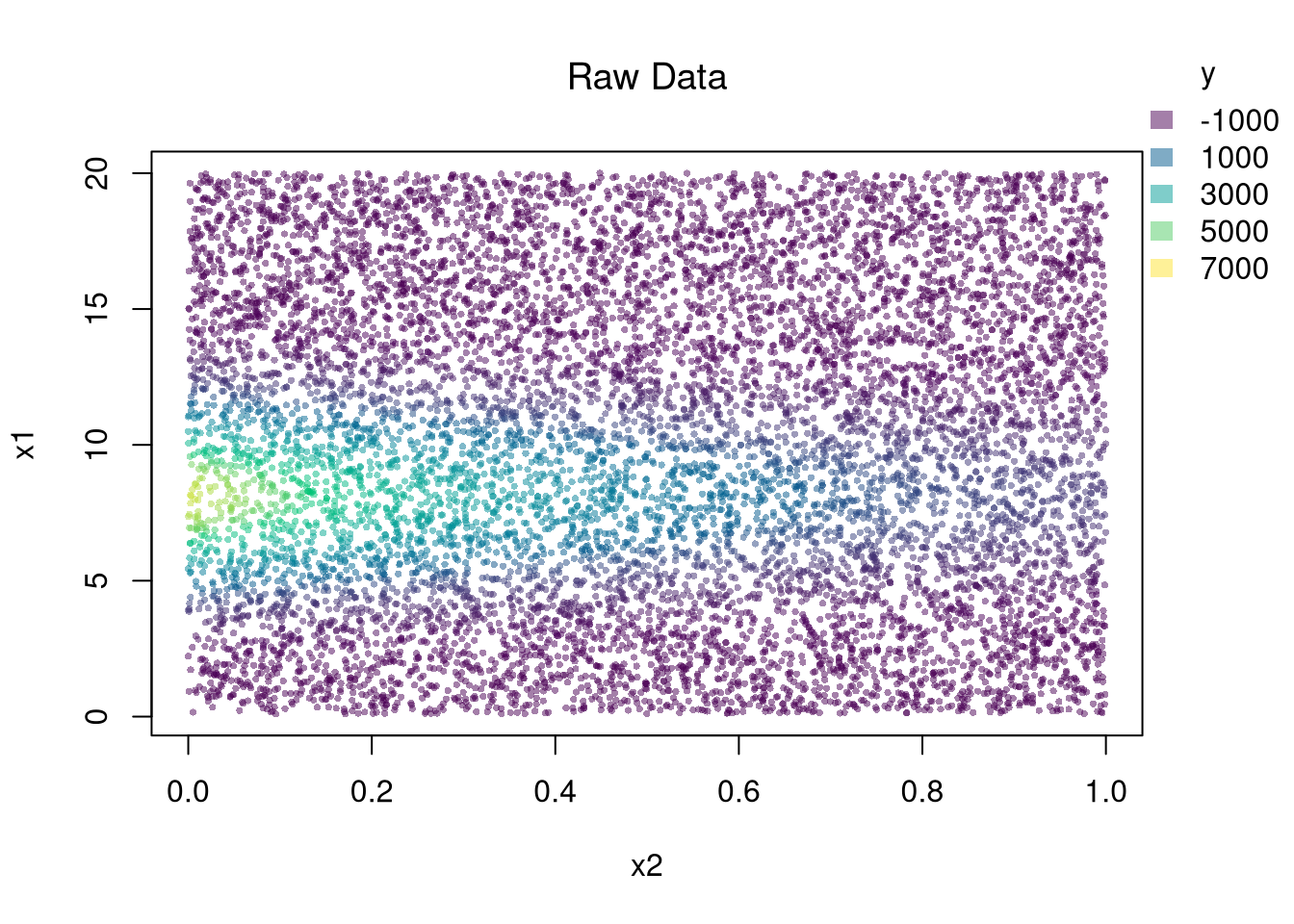 ################### Multivariate Regressogram#################### Regressogram Binsdat$x1c <-cut(dat$x1, bks1)#head(dat$x1c,3)dat$x2c <-cut(dat$x2, bks2)## Regressogramreg <-lm(y~x1c*x2c, data=dat) #nonlinear w/ complex interactions## Predicted Values## For Points in Middle of Each Binpred_df_rgrm <-expand.grid(x1c=levels(dat$x1c),x2c=levels(dat$x2c))pred_df_rgrm$yhat <-predict(reg, newdata=pred_df_rgrm)pred_df_rgrm <-cbind(pred_df_rgrm, pred_x)## Plot Predictionspar(oma=c(0,0,0,2))plot(x1~x2, pred_df_rgrm,col=ycol_pal[cut(pred_df_rgrm$yhat,col_scale)],pch=15, cex=2,main='Regressogram Predictions', font.main=1)add_legend(x='topright', col_scale=col_scale,yl=6, inset=c(0,.05),title='y')