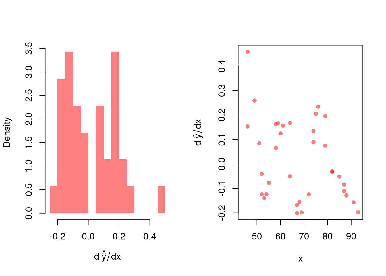 You may also be interested in a particular gradient or a single summary statistic. For example, a bivariate regressogram can estimate the marginal effect of \(X_{1}\) at the means; \(\hat{\beta_{1}}(\bar{\mathbf{x}}=[\bar{x_{1}}, \bar{x_{2}}])\). You may also be interested in the mean of the marginal effects (sometimes said simply as “average effect”), which averages the marginal effect over all datapoints in the dataset: \(1/n \sum_{i}^{n} \hat{\beta_{1}}(\mathbf{X}_{i})\), or the median marginal effect. Such statistics are single numbers that can be presented similar to an OLS regression table where each row corresponds a variable and each cell has two elements: “mean gradient (sd gradient)”.