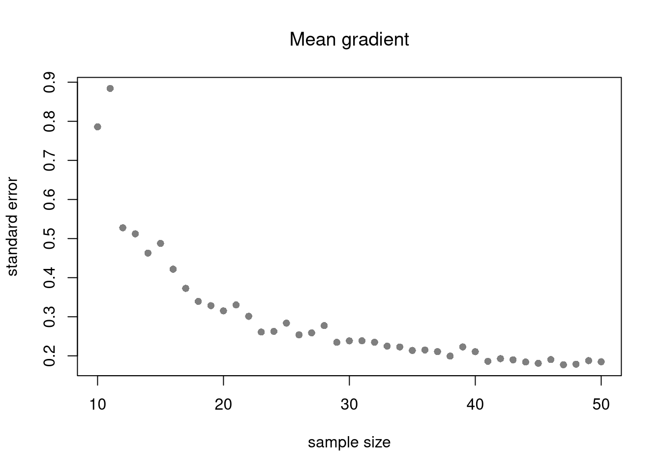 B <-300Nseq <-seq(10,50, by=1)SE <-sapply(Nseq, function(n){ sample_stat <-sapply(1:B, function(b){ x <-rnorm(n) e <-rnorm(n) y <- x*3+ x + e reg_lo <-loess(y~x) pred_lo <-predict(reg_lo) grad_lo <-diff(pred_lo)/diff(x) dydx_mean <-mean(grad_lo, na.rm=T)#dydx_sd <- sd(grad_lo, na.rm=T)return(dydx_mean) })sd(sample_stat)})plot(Nseq, SE, pch=16, col=grey(0,.5),main='Mean gradient', font.main=1,ylab='standard error',xlab='sample size')