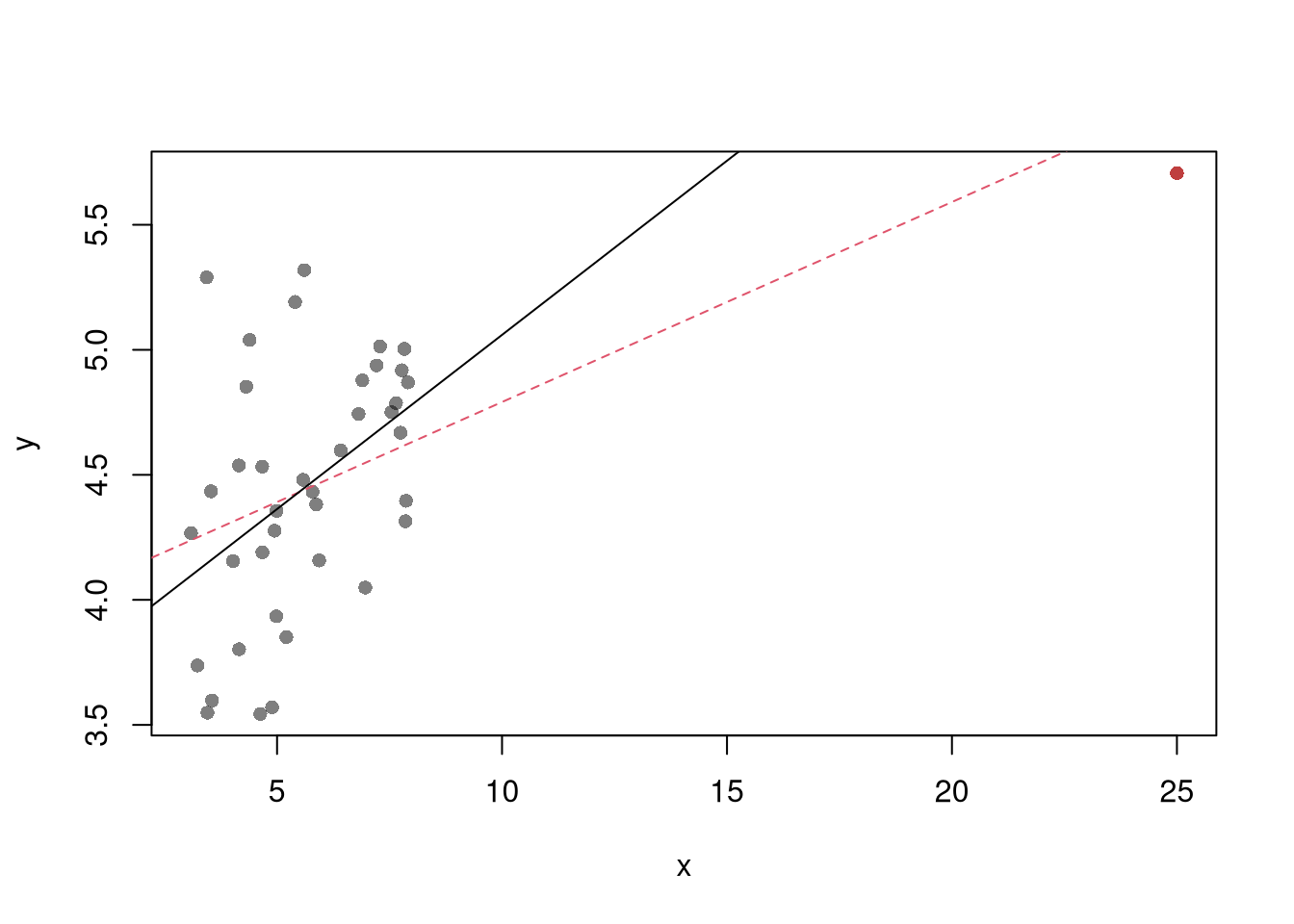The third diagnostic plot examines another type of outlier, the observed explanatory variable \(\hat{X}_{i}\) is far from the others. A point has high leverage if the estimates change dramatically when you estimate the model without that data point.