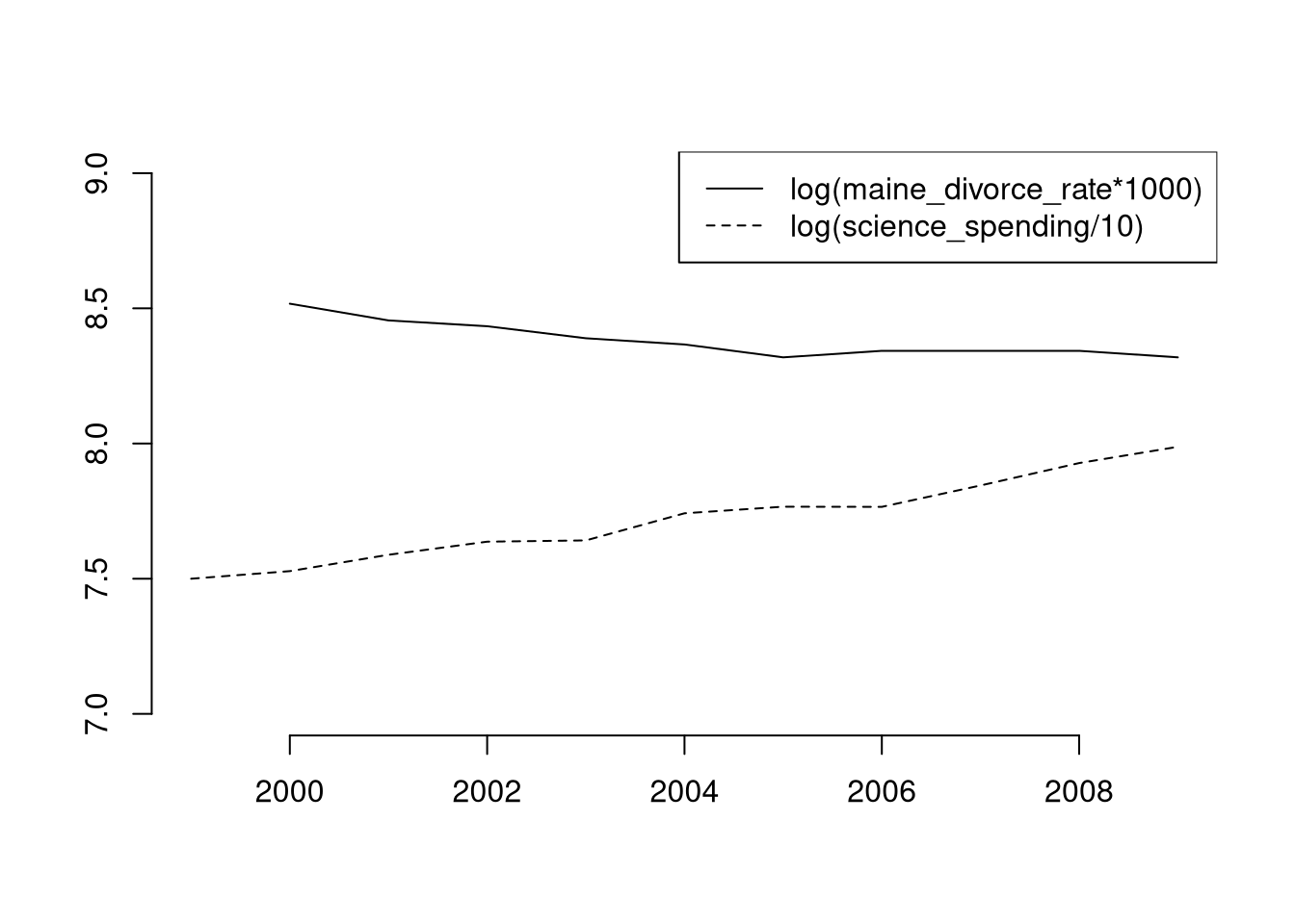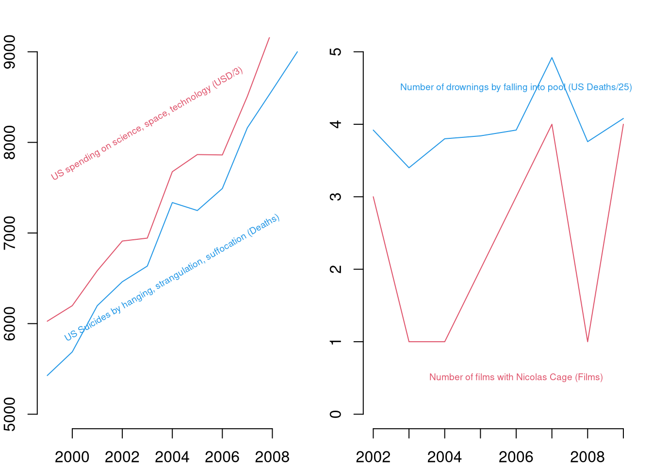 par(mfrow=c(1,2), mar=c(2,2,2,1))plot.new()plot.window(xlim=c(1999, 2009), ylim=c(5,9)*1000)lines(science_spending/3~year, data=vigen_csv, lty=1, col=2, pch=16)text(2003, 8200, 'US spending on science, space, technology (USD/3)', col=2, cex=.6, srt=30)lines(hanging_suicides~year, data=vigen_csv, lty=1, col=4, pch=16)text(2004, 6500, 'US Suicides by hanging, strangulation, suffocation (Deaths)', col=4, cex=.6, srt=30)axis(1)axis(2)plot.new()plot.window(xlim=c(2002, 2009), ylim=c(0,5))lines(cage_films~year, data=vigen_csv[vigen_csv$year>=2002,], lty=1, col=2, pch=16)text(2006, 0.5, 'Number of films with Nicolas Cage (Films)', col=2, cex=.6, srt=0)lines(pool_fall_drownings/25~year, data=vigen_csv[vigen_csv$year>=2002,], lty=1, col=4, pch=16)text(2006, 4.5, 'Number of drownings by falling into pool (US Deaths/25)', col=4, cex=.6, srt=0)axis(1)axis(2)