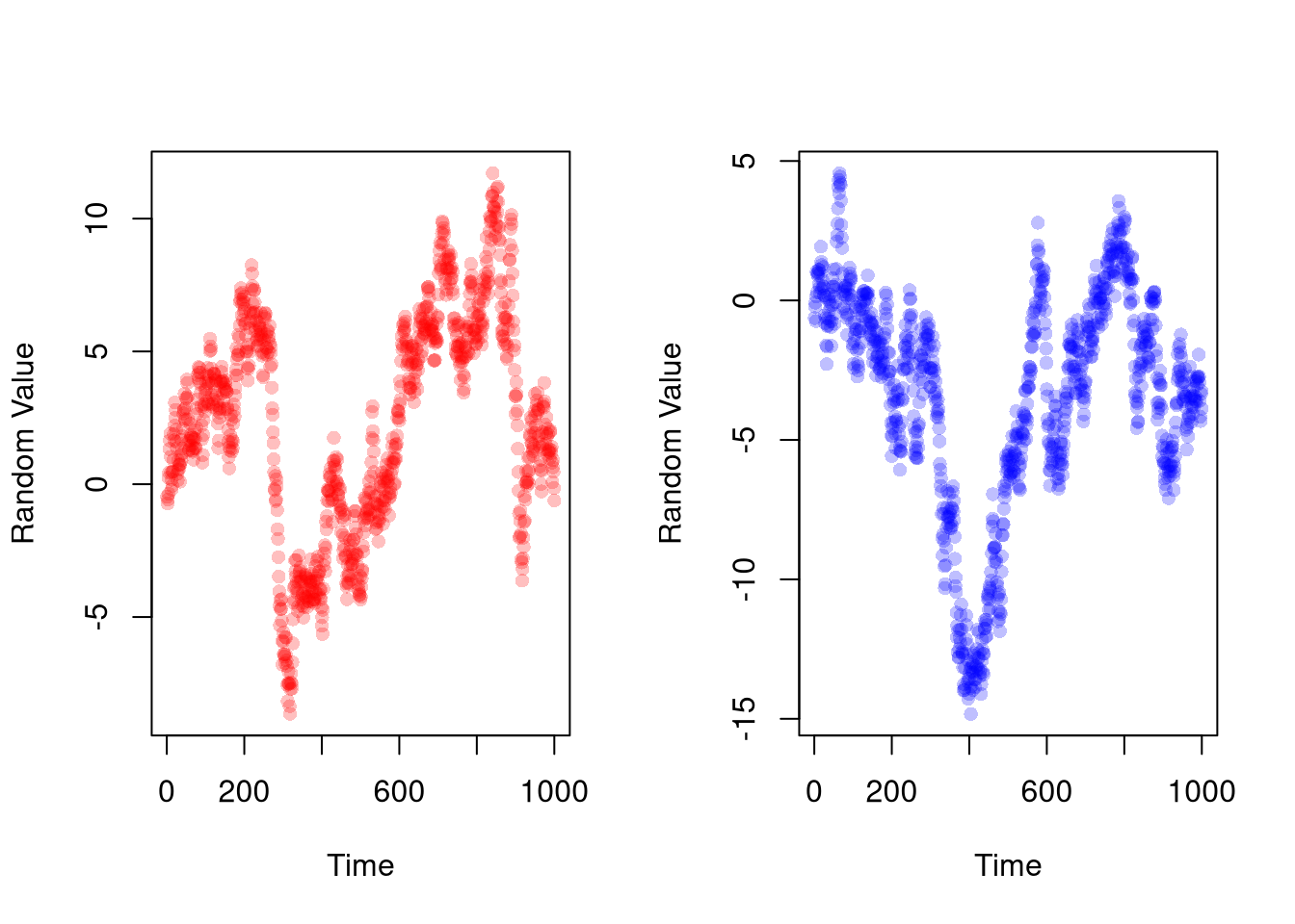 # Find a reversal of fortune# (A good story always goes well with a nice pre-trend)n2 <-318wind2 <-c(n2-20,n2+20)plot(random_walk2, pch=16, col=rgb(0,0,1,.5),xlim=wind2, ylim=c(-15,15), xlab='Time', ylab='Random Value')points(random_walk1, pch=16, col=rgb(1,0,0,.5))abline(v=n2, lty=2)